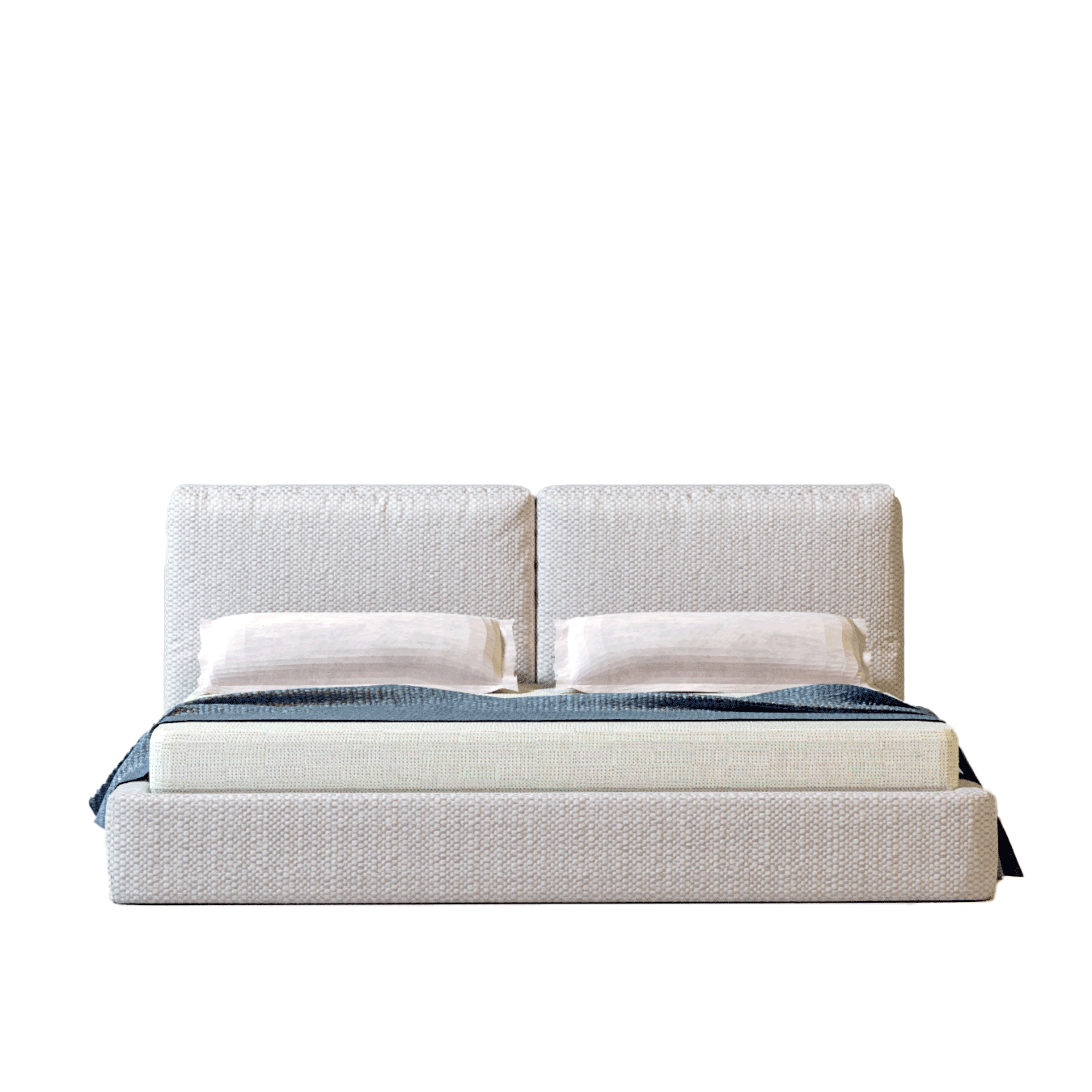its base is a low-profile, rectangular with straight edges, covered in the same fabric as the headboard.