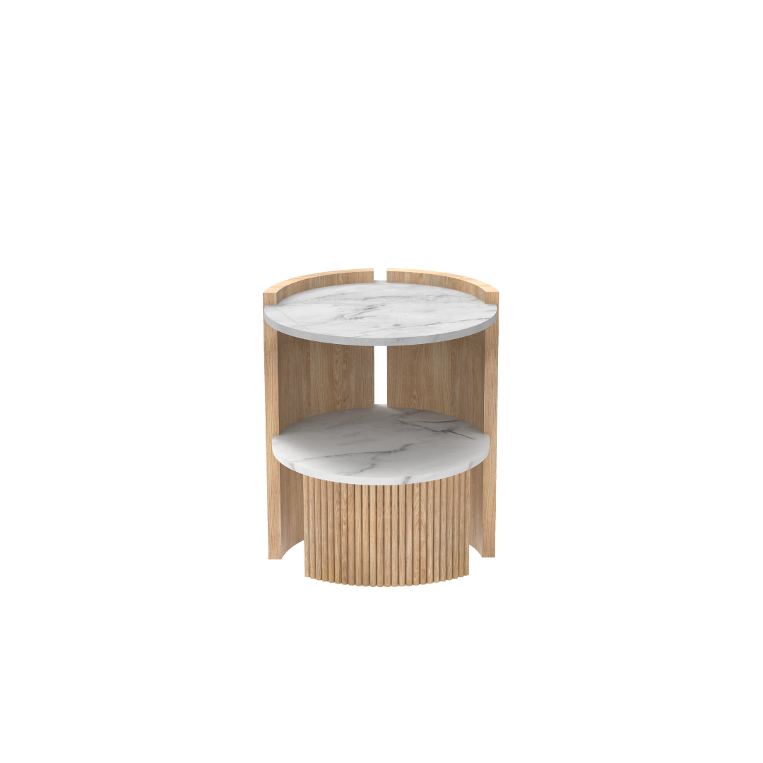 Nightstand with a layered circular design, Its Top & Shelf are two round marble surfaces (top and middle), featuring subtle gray veining.
