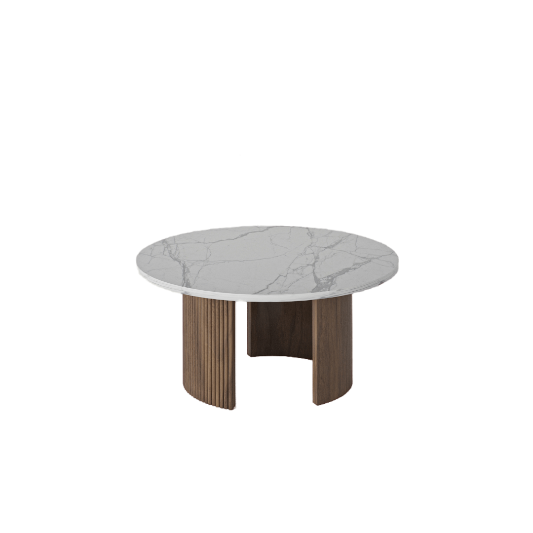 its base is made of wood, two curved panels arranged evenly around the table, each featuring vertical grooves.